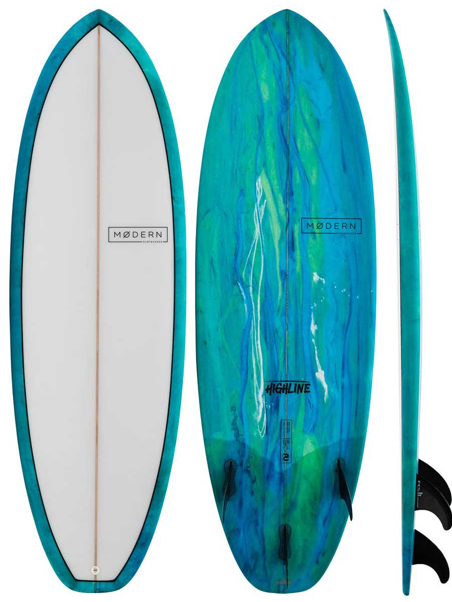 With the Modern Highline we examined what novice-to-intermediate surfers need in a surfboard to help them get as much actual surfing experience as possible. To become a better surfer, catching waves and increasing your confidence is the key, so we designed this board to be very buoyant (easy to paddle), stable (easy to get to your feet), and easy to control (smooth turns & go where you want on a wave). Essentially, we built this board to re-define the first steps in surfing so people develop their skills quicker and maximise the enjoyment they get from riding waves.